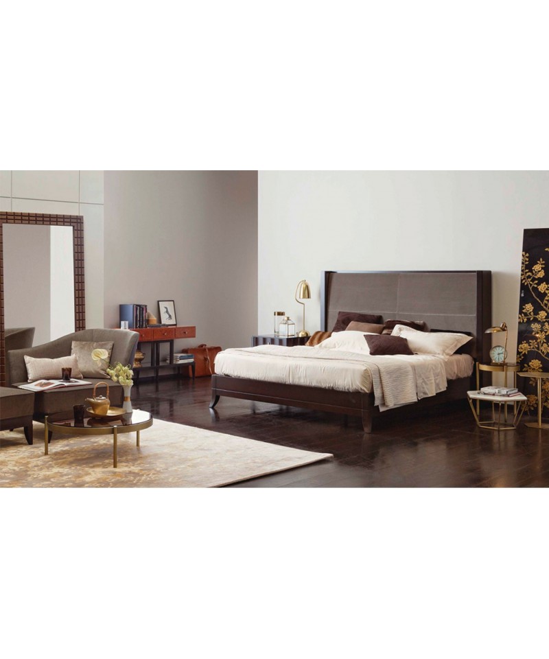 Philipp Selva's bed design delights by the contrasting combination of discreet design and luxurious materials. The massive mahogany construction decorated with velvet headboard, divided into four segments with exquisite stitching. Create your perfect sleeping space with Downtown.