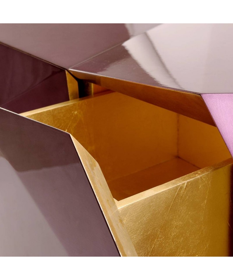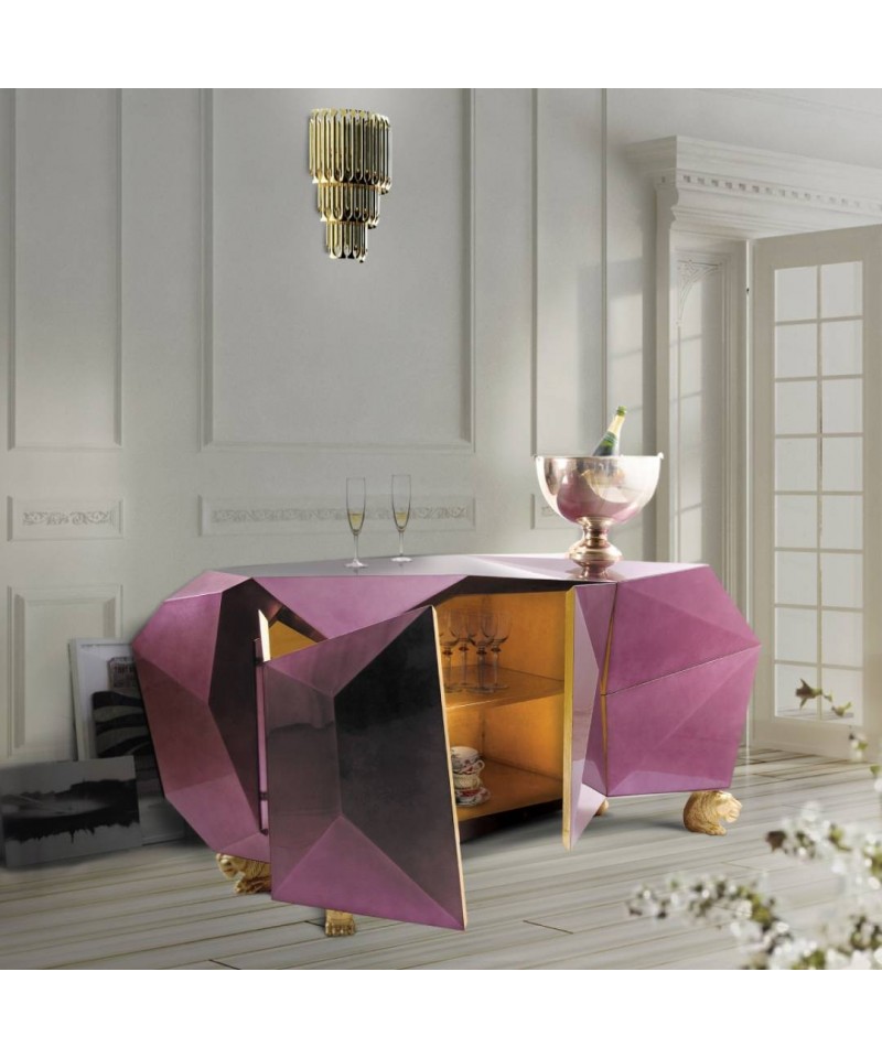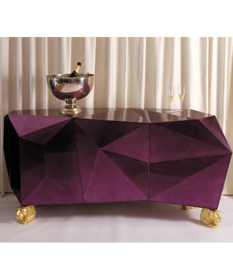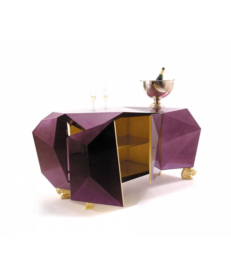 Projected to be the jewel in the crown of the Portuguese brand Boca do Lobo, the Diamond Sideboard is a reflection of the furniture jeweler’s expertise and quintessence, undoubtedly deserving its title. This opulent object, full of resources and desire, has two carefully sculpted doors that reveal a gold lined interior with shelves and two drawers. This piece is inspired by the gothic furniture of the romantic period, with its capacity to take advantage of the power of imagination, prevision and escape, without forgetting its unique character. Product features: Gold leaf with transluscid amethyst colour, gold-leaf interiors, hand carved feet details with gold leaf finish.