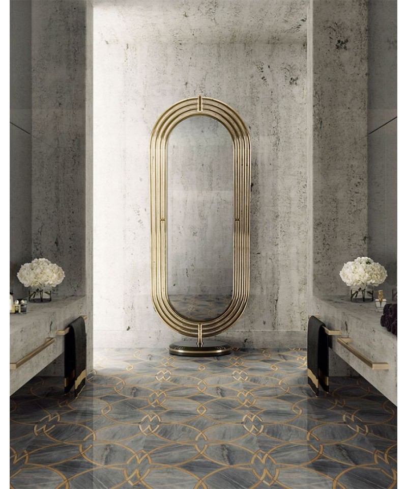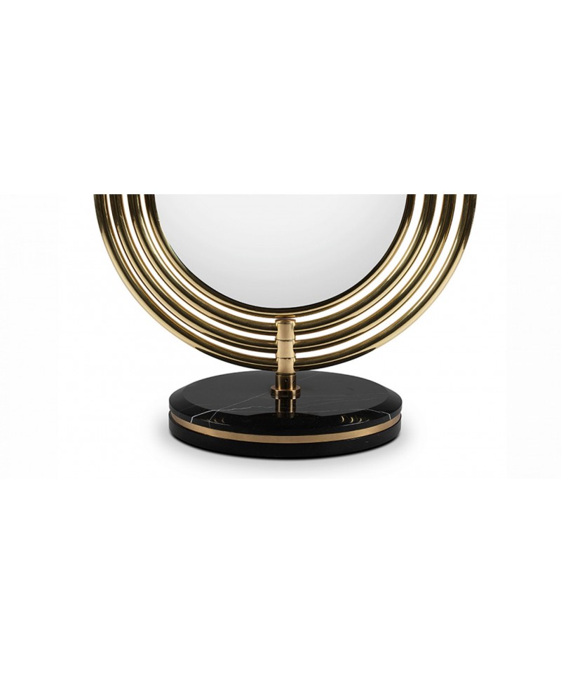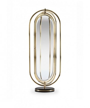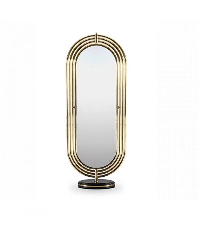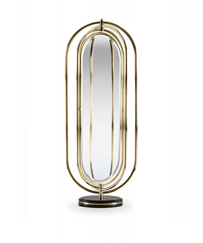 Colosseum is a full length floor mirror supported by a nero marquina marble base accented by a brass trim around it. The frame structure is built in polished brass tubes, assembled to produce an oblong shape. The rings rotate 360 degrees, making this mirror a flexible and perfect piece to decorate your interior.
