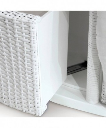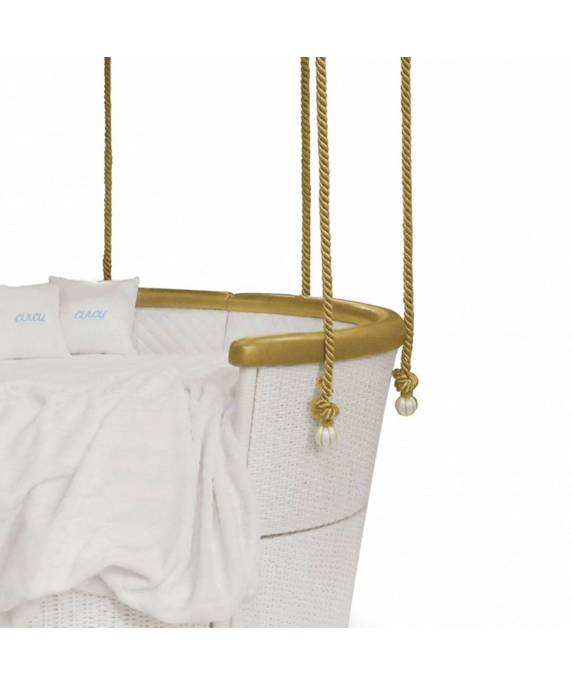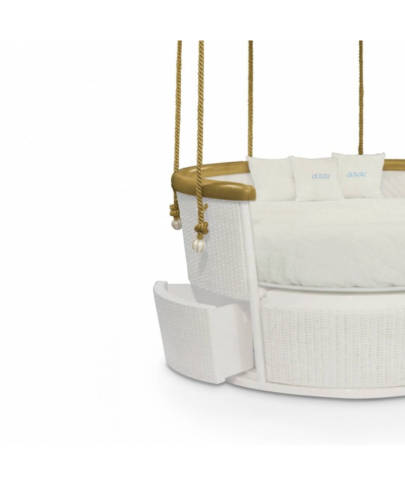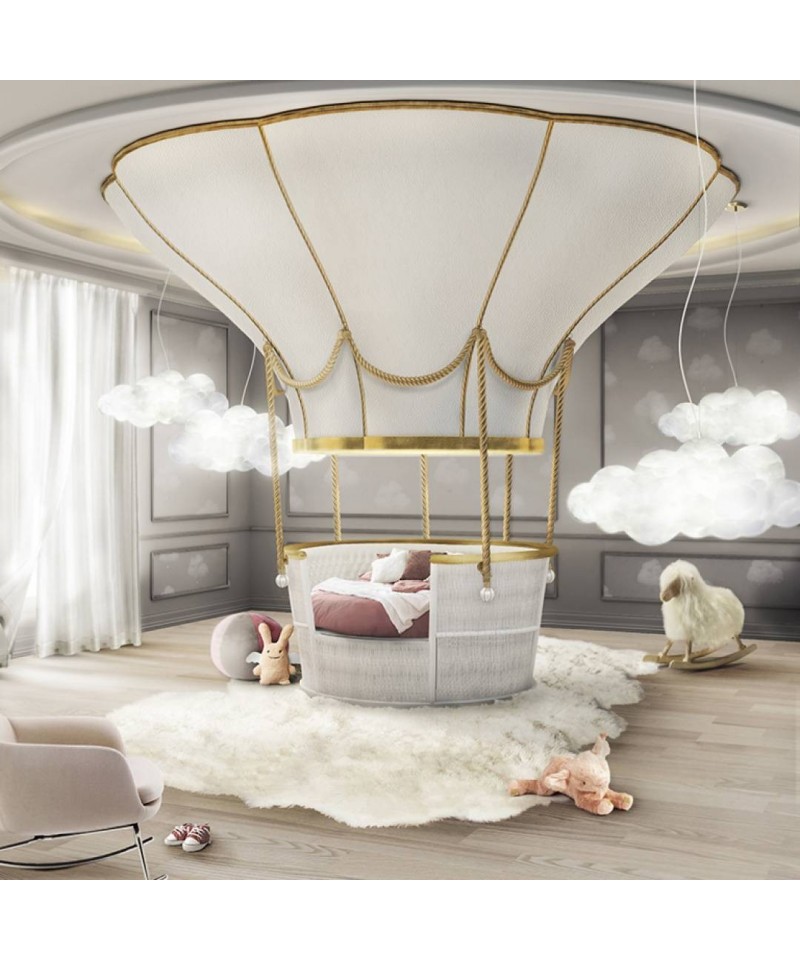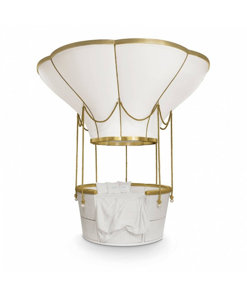 The bed part is made with traditional besketry technique, with remaining structure made of wood with white lacquered gloss finishes. It contains drawers that can be used as storage. This bottom part can also be converted into a sofa. The top parts are all upholstered in synthetic leather, trimmed in wood with gold leaf details. The strings are made by hand with traditional techniques and the metal parts are finished in gold bath. Light and sound system are controlled by a mobile app (light) with several options: choise of music,light effects and sleep time.