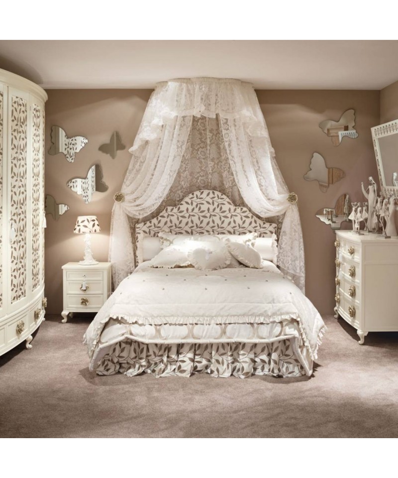 The Spencer bed from Halley is a classic model with a high soft curly headboard. The design wins its dynamism and decorative. The price includes: Bed Spencer with edging and a skirt from below. Dimensions: 160 x 215 x H 146 cm Baldakhin for figured lambrequin: 110 x 80.5 centimeters Curtain set: 1 curtain for 110 x H 280 cm, 2 curtains for 125 x H 280 cm A pair of holders in the form of roses: Ø 13 x H 5.5 cm Set of bed linen with white lace Pillow: 80 x 50 cm Pillow with edging and frill: 80 x 50 cm Pillow with edging and frill: 60 x 40 cm Pillow: 80 x 50 cm Roller: 143 x Ø 28 cm Kokarda made of lace (2 pcs.) Heart-shaped pads: Ø 40 cm (2 pcs.) Pillows in the form of heart: small: Ø 35 cm (2 pcs.) Hearts with ribbon (3 pcs.) Decorative cover: 23 0 x 240 cm White soft blanket: 23 0 x 240 cm Plaid: 23 0 x 95 cm