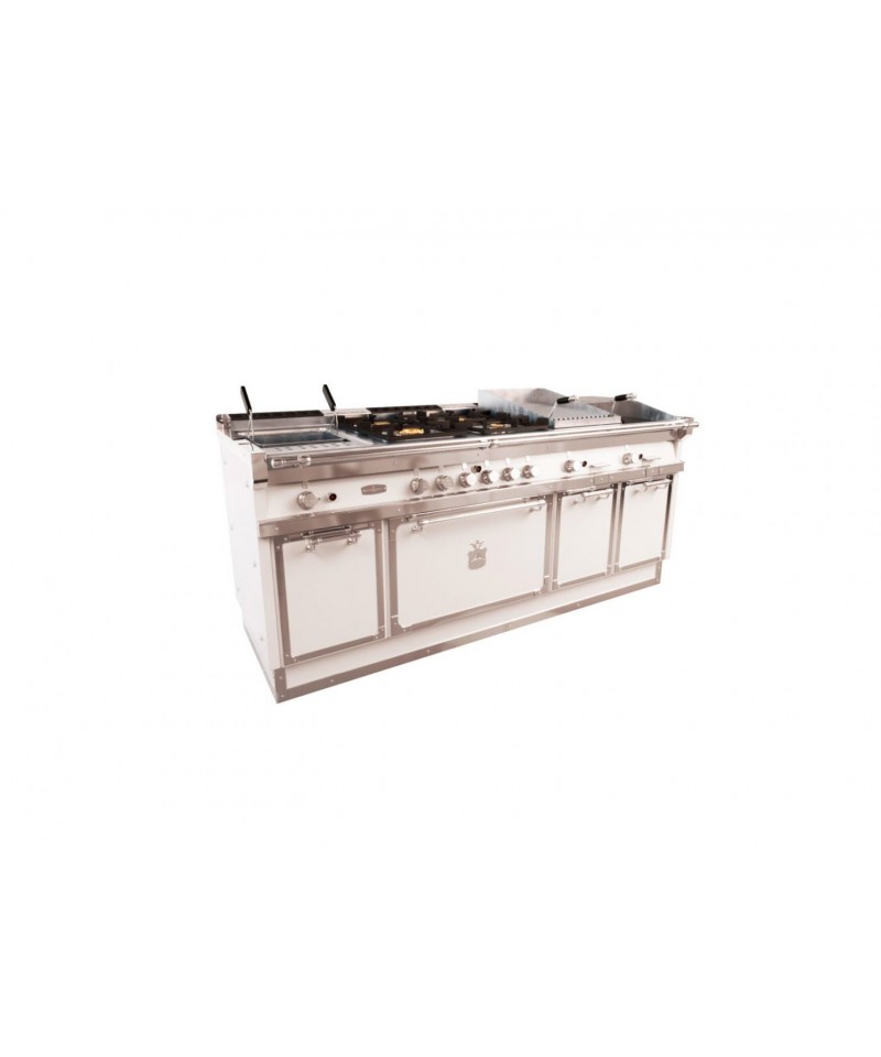 The quality, technology and materials of the great kitchens by Officine Gullo, now available in versions suitable for a flat. Professional cooking suite 81 7/8″ wide (28 3/4″ deep) cooking suite equipped with maxi 800 mm steel GN2/1 oven. The body is made of heavy gauge steel. Characteristics - Gastronorm containers, with a capacity of up to 8 GN1/1 - 40 cm door cabinet element. - High performance solid brass burners up to 7,5 kW of output power - Gas fueled lava stone barbecue with special smokeless grill - Pasta cooker/steamer.