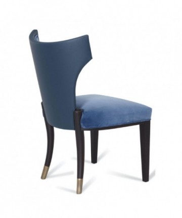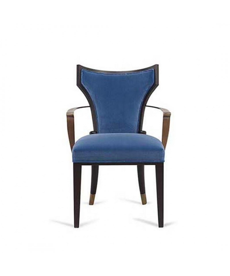 An elegant chair combining very different materials in an elegant, harmonious whole. Available in a variety of different finishes, it is presented here in a combination featuring a grey oak frame, a seat and internal backrest made of luxury fabric, and arms and foot rests of antique bronze on brass. The back of the chair is always wrapped in leather. In this version: Nubuk.