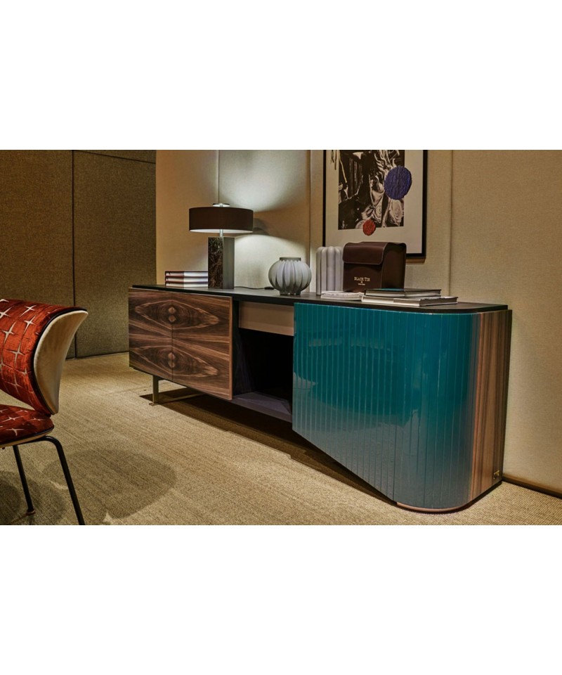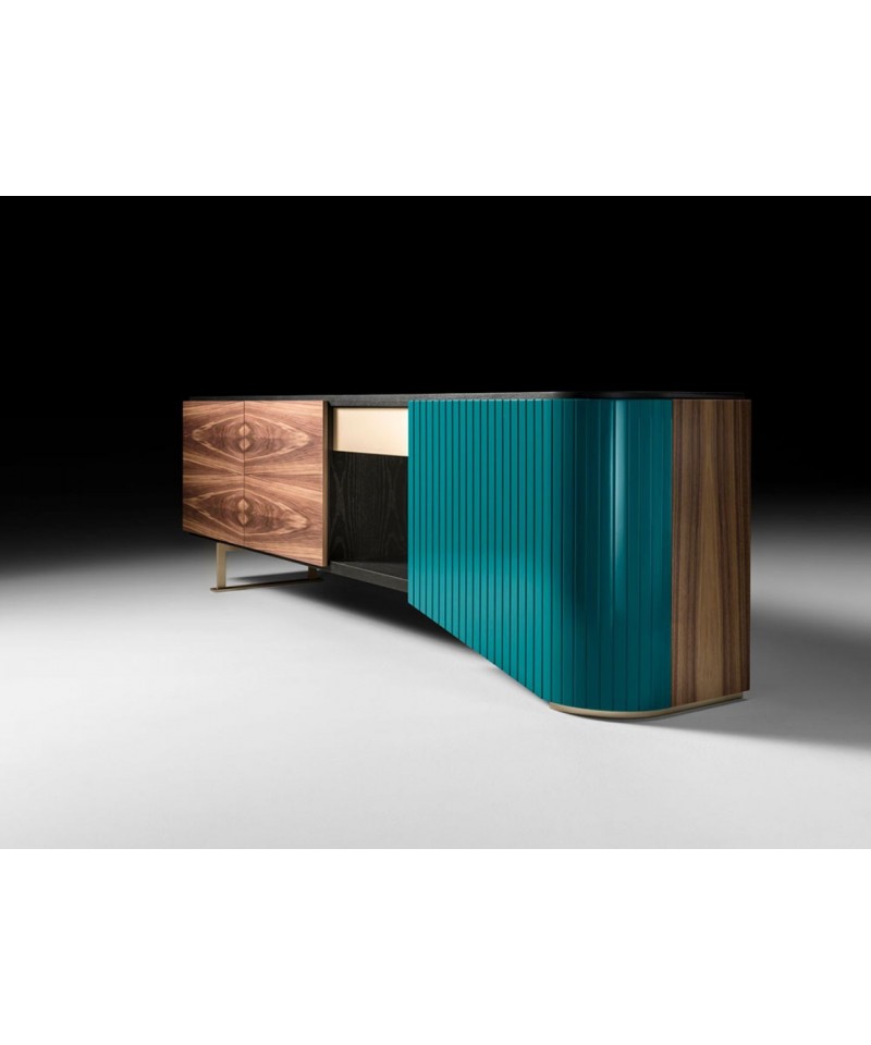 Specifications: Dimensions Width: 250 cm Depth: 52 cm Height: 80 cm Material Poplar wood Ash moka veneer MDF High gloss polyester lacquer finish Canaletto walnut Matt gold finishing