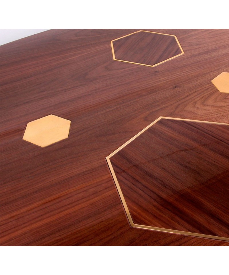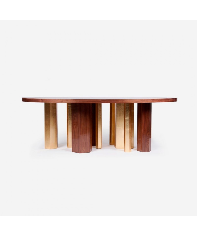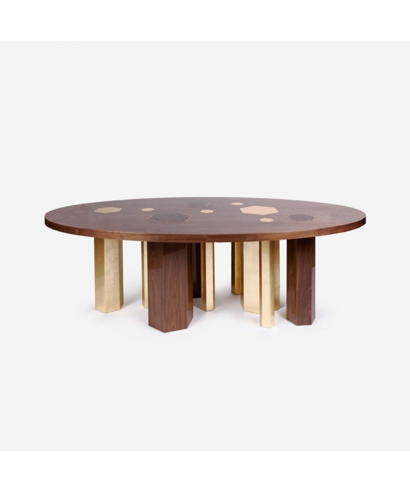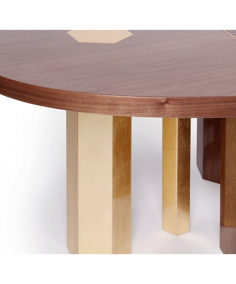 The different shapes of the dining table are common on the way they are sustained. The Wooden hexagons are reflected on the cover by a brass frame and the golden leafed are prolonged to the top reflecting its luxury shades. Oval base is made of Wallnut with gold leafed legs and tops and brass frames.
