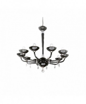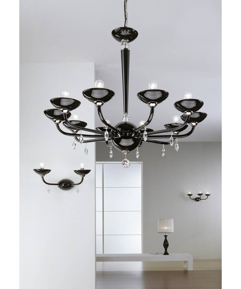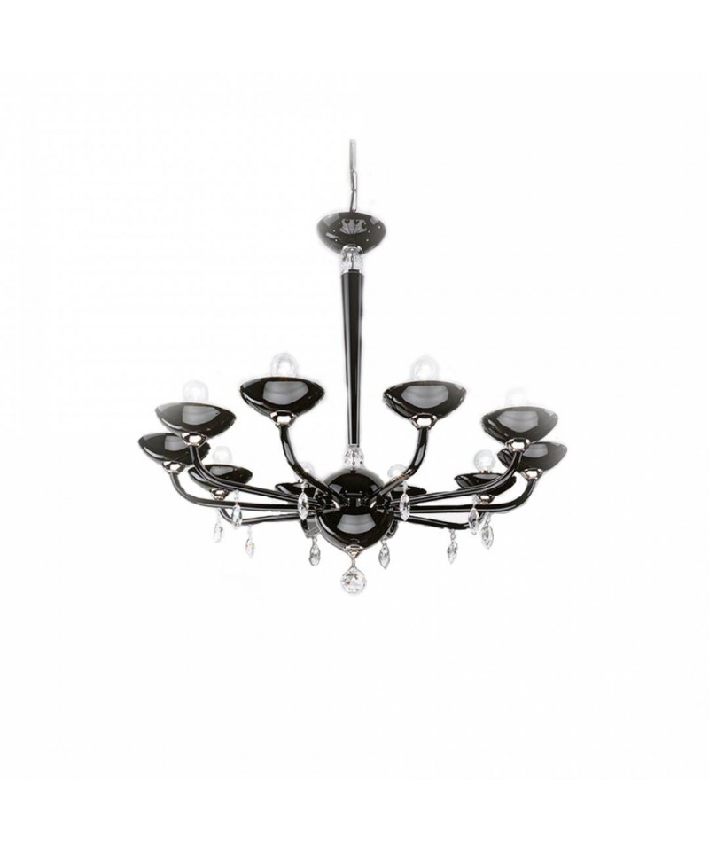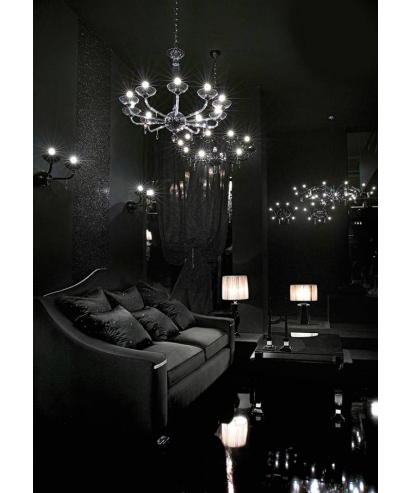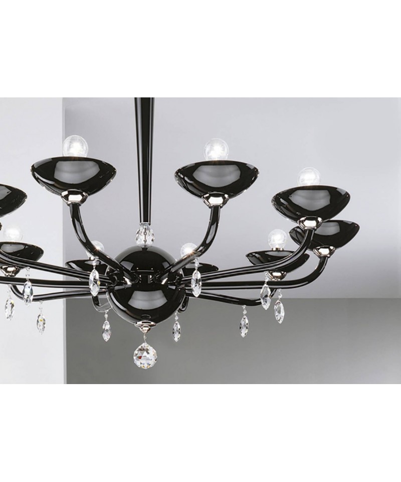 Chandelier realized in Murano glass in black colour and embellished by the finishing of chrome plated metal, Swarovski Elements drop shaped pendants. Essential and minimal beauty, the basic illumination create a game of light, reflection and shadows which envelope the ambient with intensity of a caress of moderne elegance.