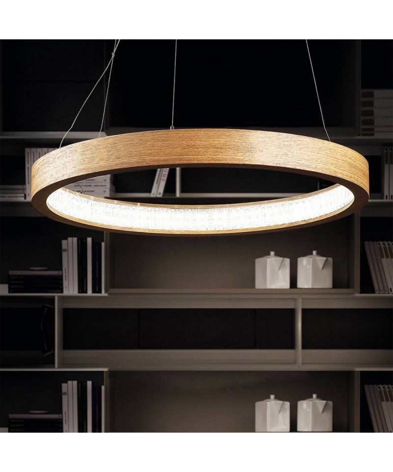 Chandelier Libe Round in a modern style will certainly draw the attention of all those present in the room. Fill the atmosphere with warmth, comfort and at the same time the originality and sense of style. LED lamp in natural oak wood. The diffusion of light is amplified by Asfour crystal lozenges. Chromed metal base.