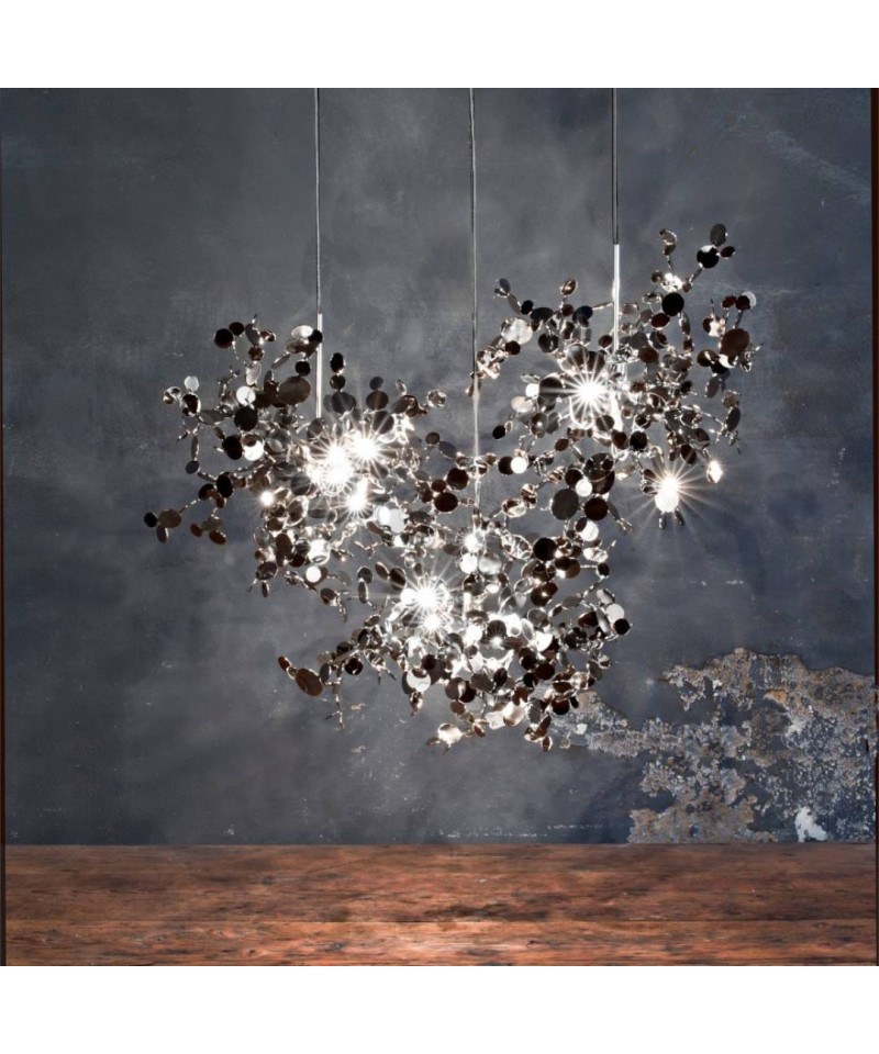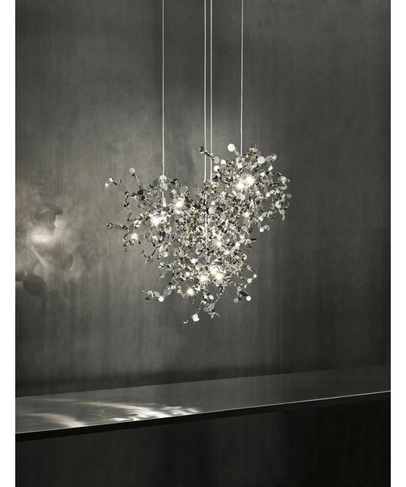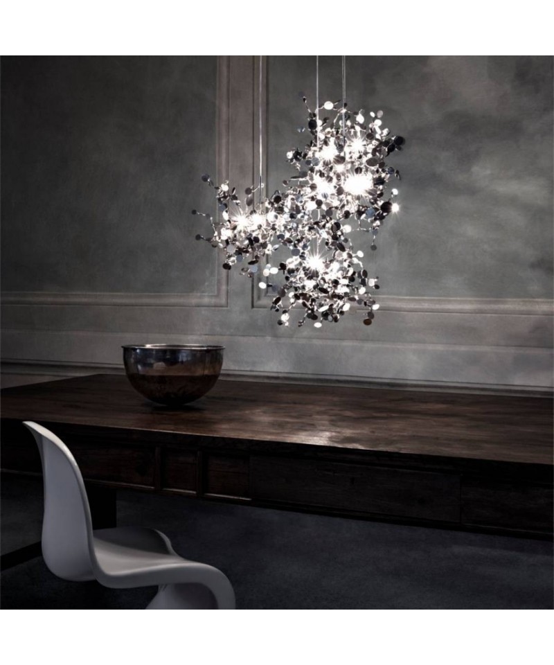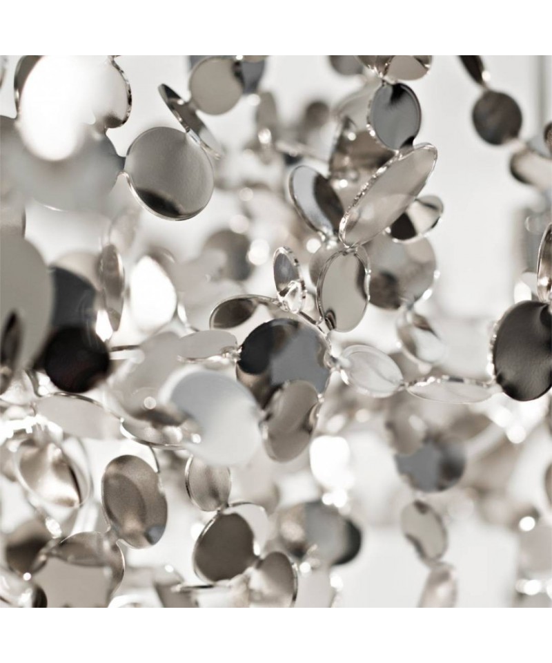 With this new suspension light, designer Dodo Arslan creates a shimmering, silver cloud. Argent consist of metal discs that have been meticulously shaped by hand by Terzani Craftsmen into clusters. Once lit, the multiple, angled surfaces of the discs emante a soft, shimmering, white glow.