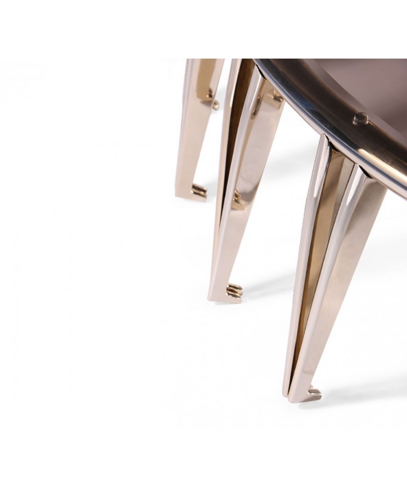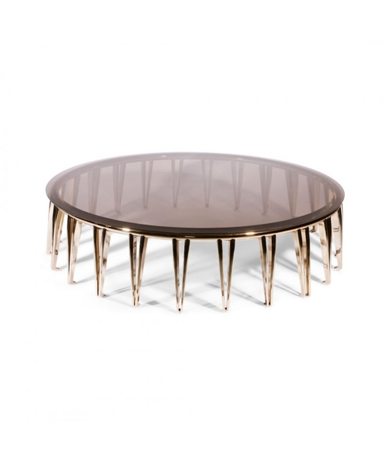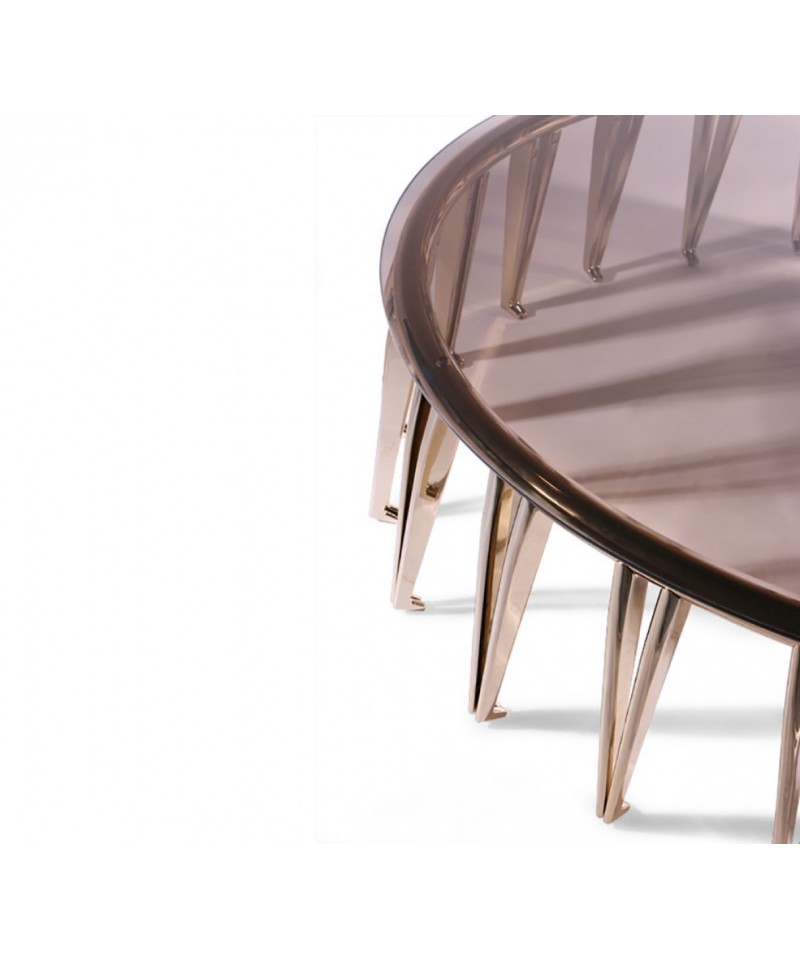 Newson is a mid-century styled low coffee table ready to set a tone in your living room look. It sets up a strong contrast between the heavy gold plated brass structure with “V” shaped legs and the brown smoked glass surface. A perfect fit for either classic or modern living rooms.