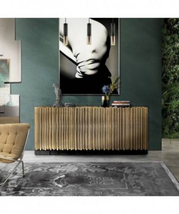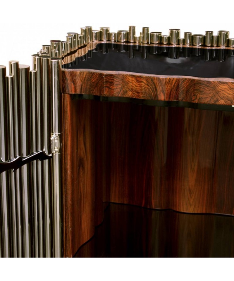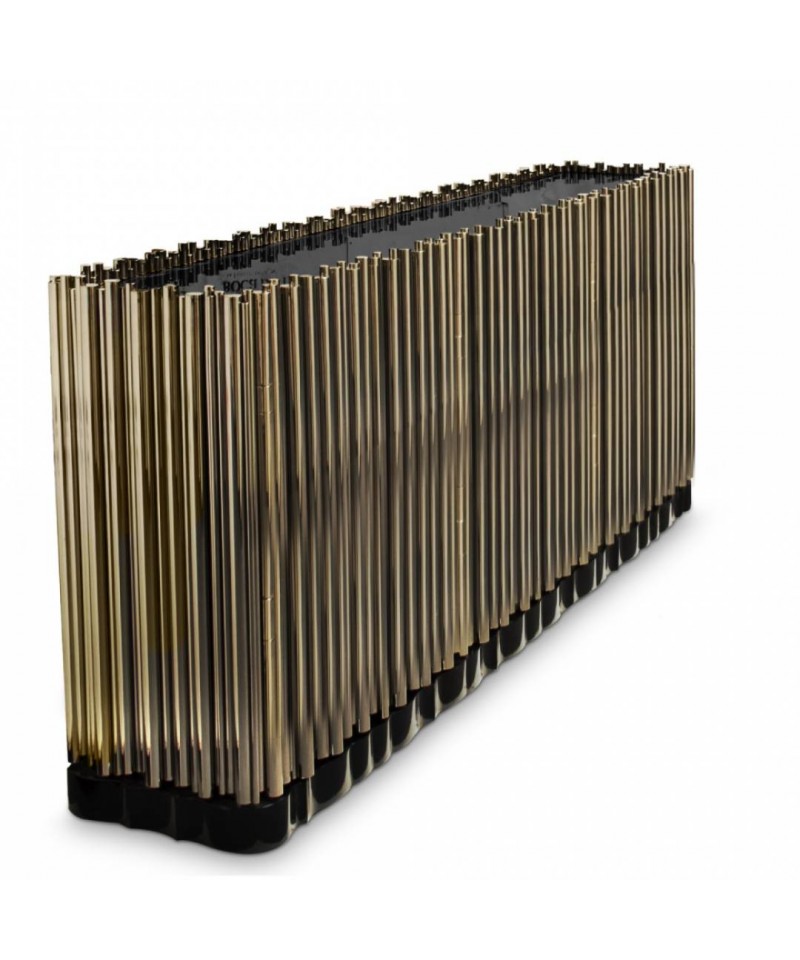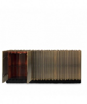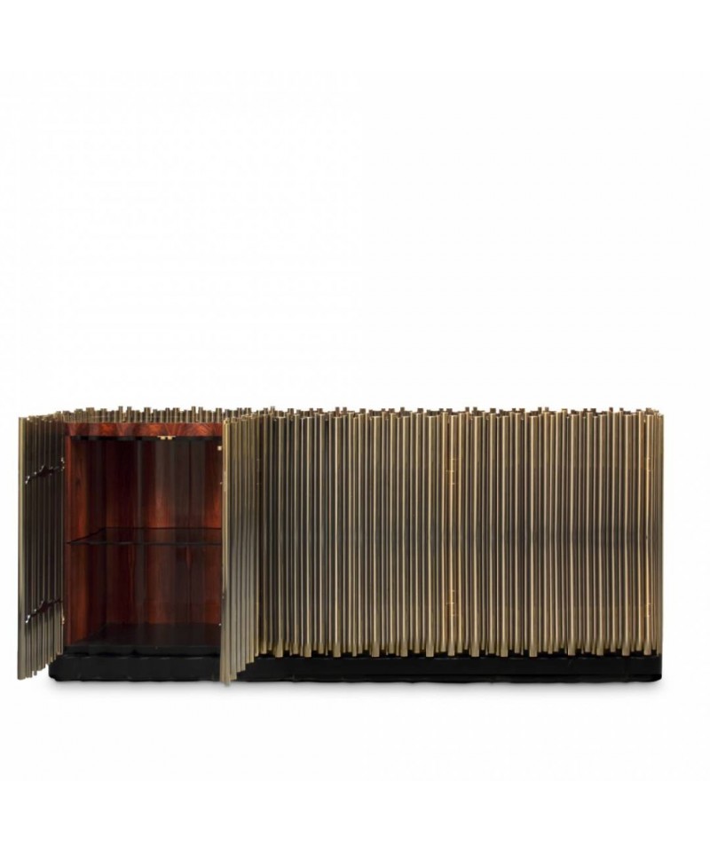 The Symphony Sideboard draws inspiration from church organ tubes, as well as the curves of violin. Like all of Boca do Lobo’s designs, the Symphony is hand made by experienced craftsmen, each with different specialities, from metal-work to wood carving. It features a cluster of polished brass tubes envelope an exotic wood structure, creating a harmonious artful juxtaposition to rhythm of the pipes. Through Boca do Lobo’s vision, the Symphony seeks to re-interpret classic elements through contemporary design and cutting-edge technology, and has become an emblematic piece within the Limited Edition Collection. Sideboard made from wood finished covered by a tubular structure in gold plated brass. In its interior there are two glass shelves and a set of drawers covered with rosewood veneer.