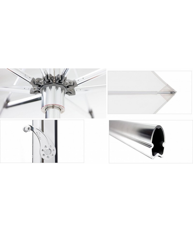 Specifications: Dimensions Diameter: 400 cm Height: 267 cm Material Aluminum max acorn Fabric textured bright white Stainless steel Polished titanium